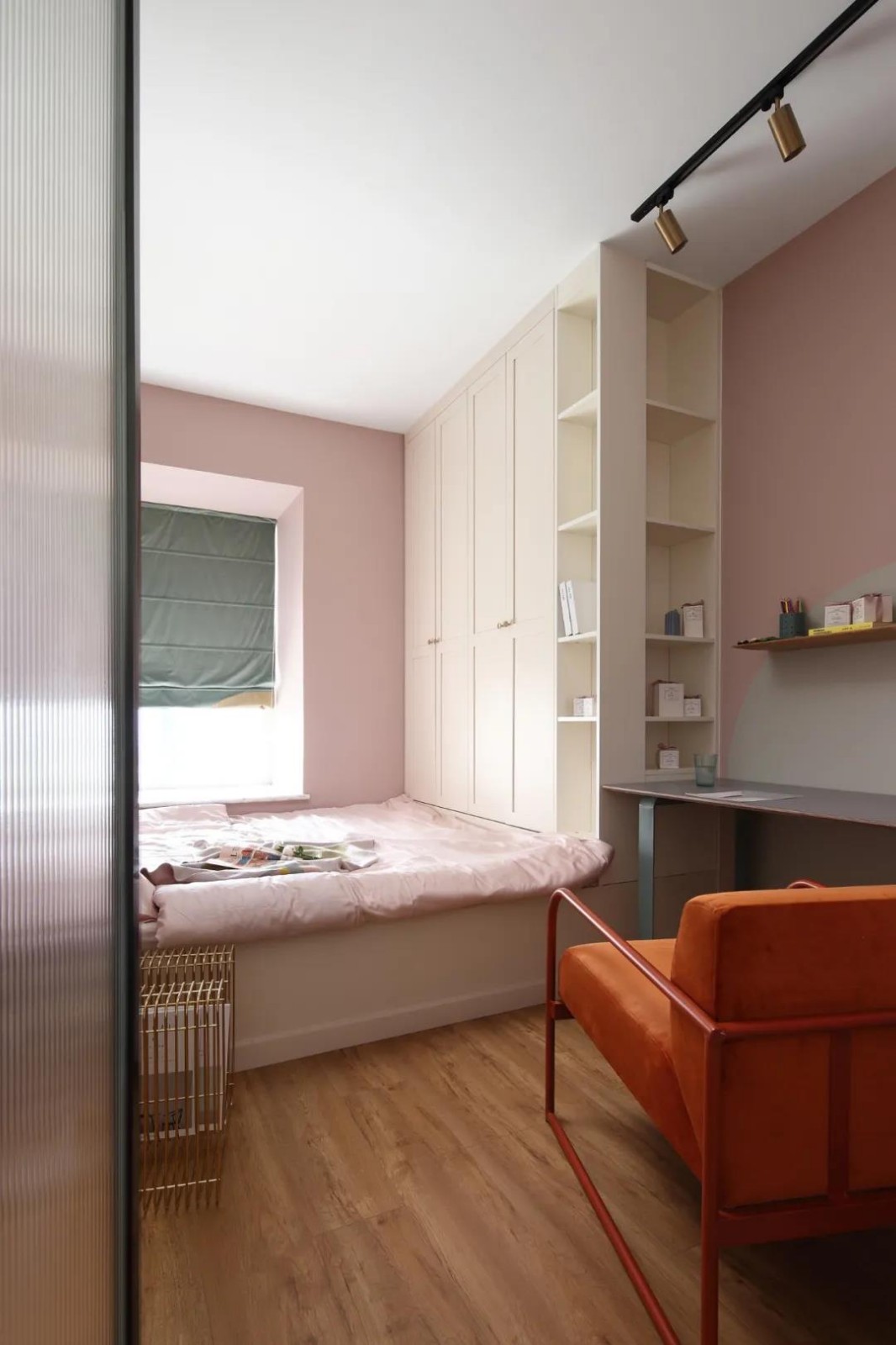 書(shū)房在粉色的墻面空間下,布置粉色床單,以象牙白的定制榻榻米、衣柜相呼應(yīng),在書(shū)桌旁邊的衣柜加入開(kāi)放書(shū)架,整體空間的收納更加實(shí)用靈活。
